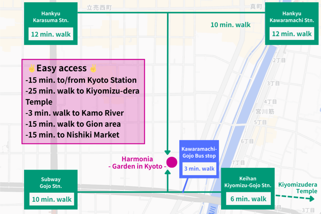 • By city bus: approx. 10 minutes (get off at Kawaramachi-Gojo bus stop) + 3-minute walk